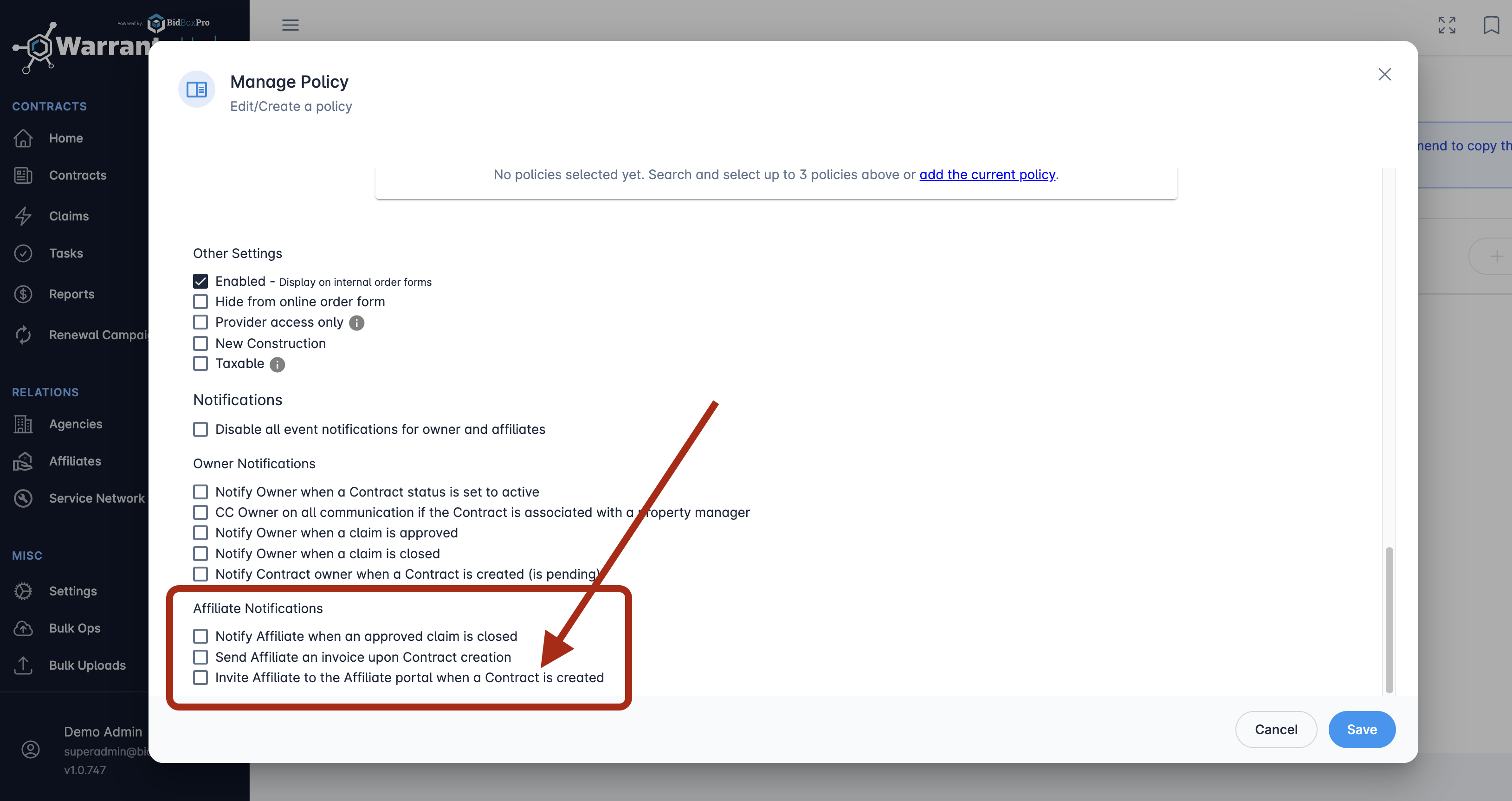Adjust Policy settings to invite and grant access to the Affiliate Portal during Contract creation.
