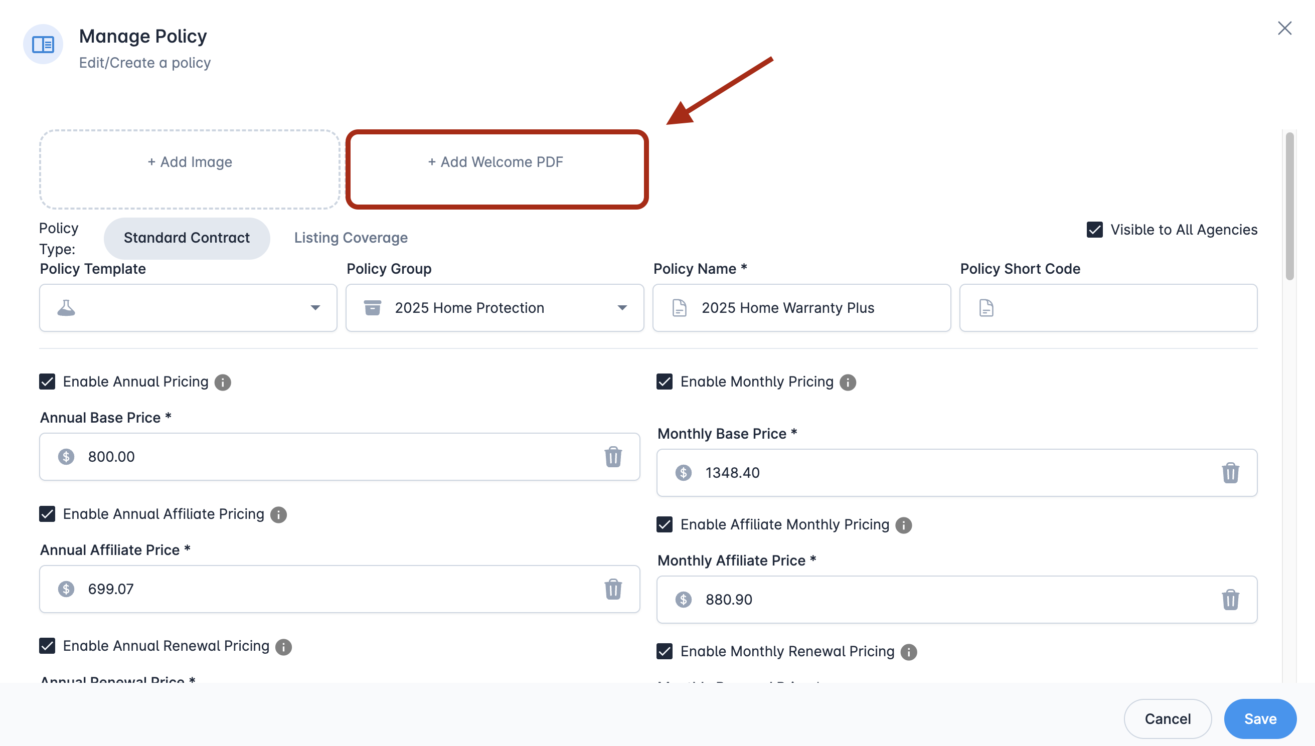 In the policy details, select Change Welcome Packet to update your current packet or Add Welcome Packet to upload a new document.