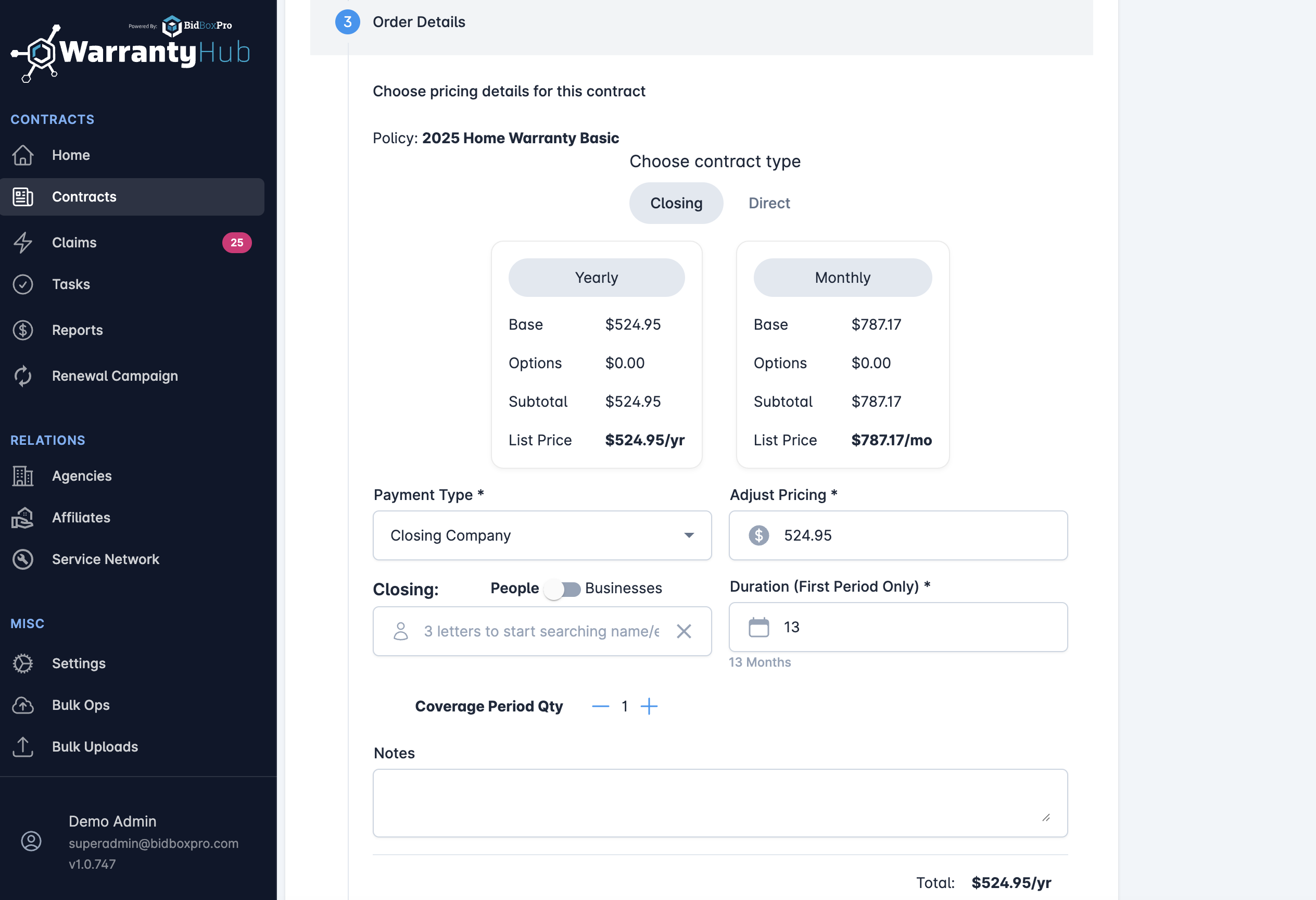 Select contract type of Closing or Direct