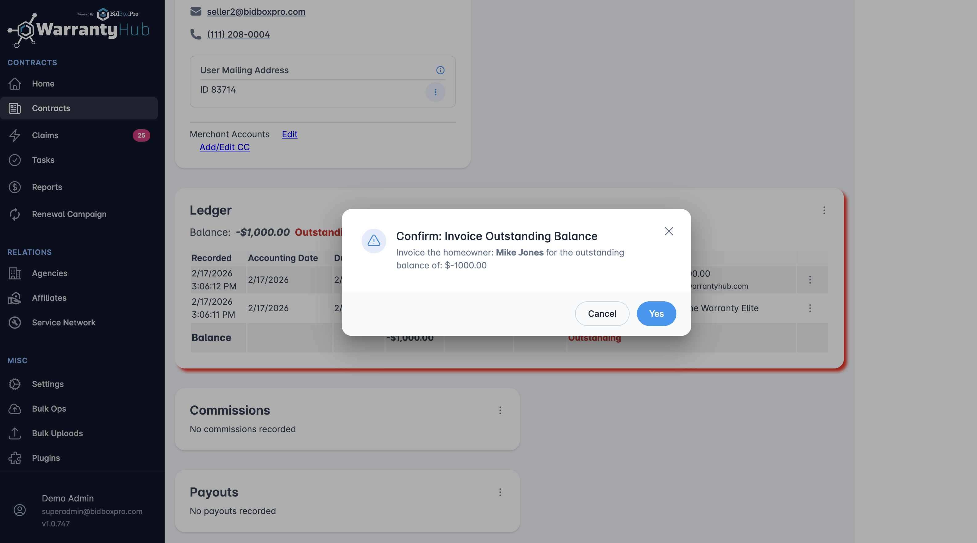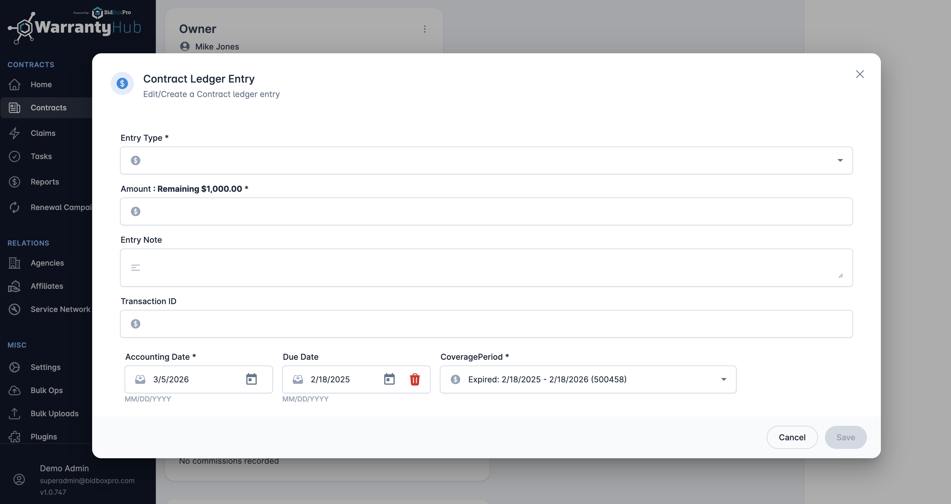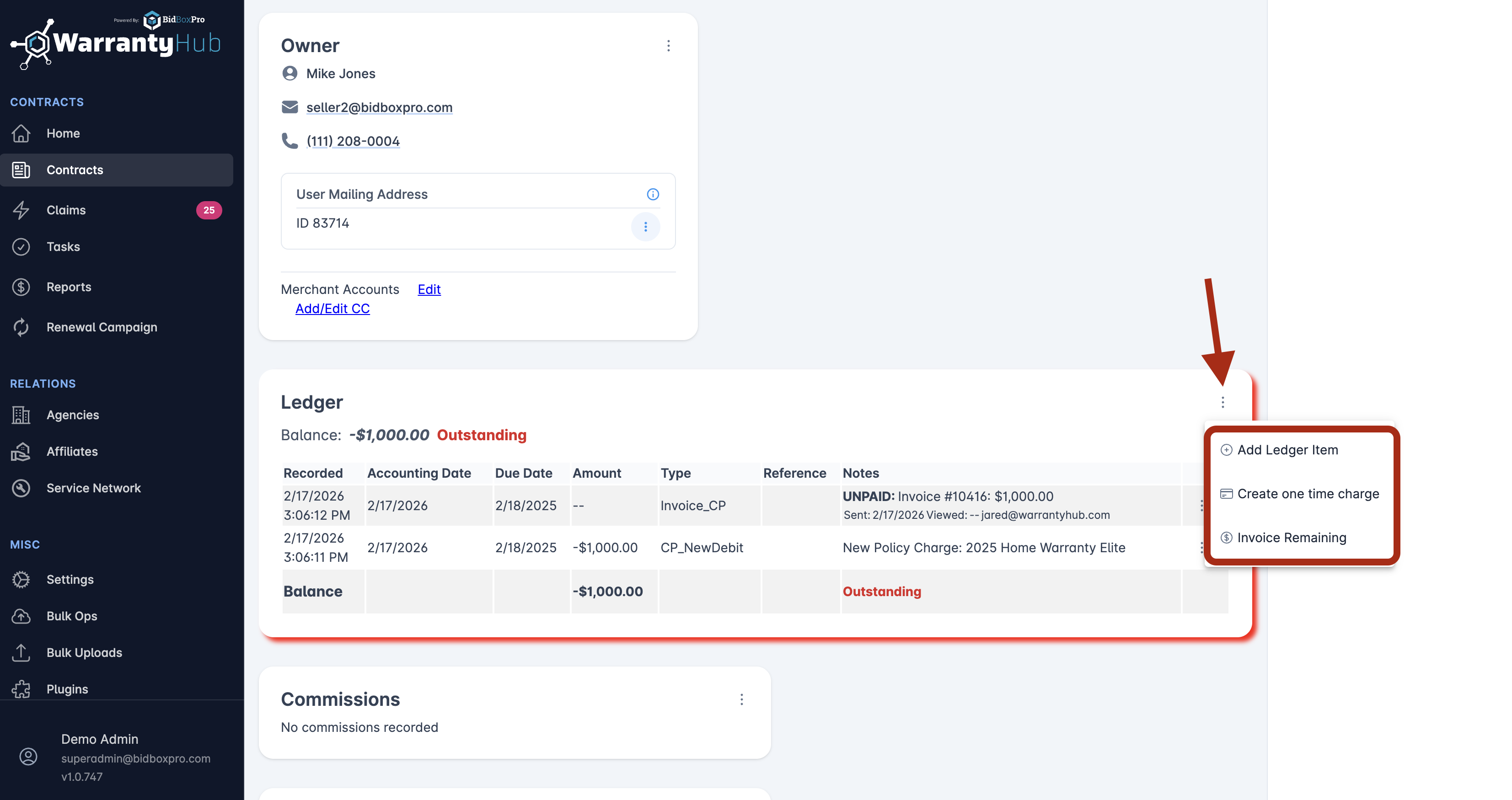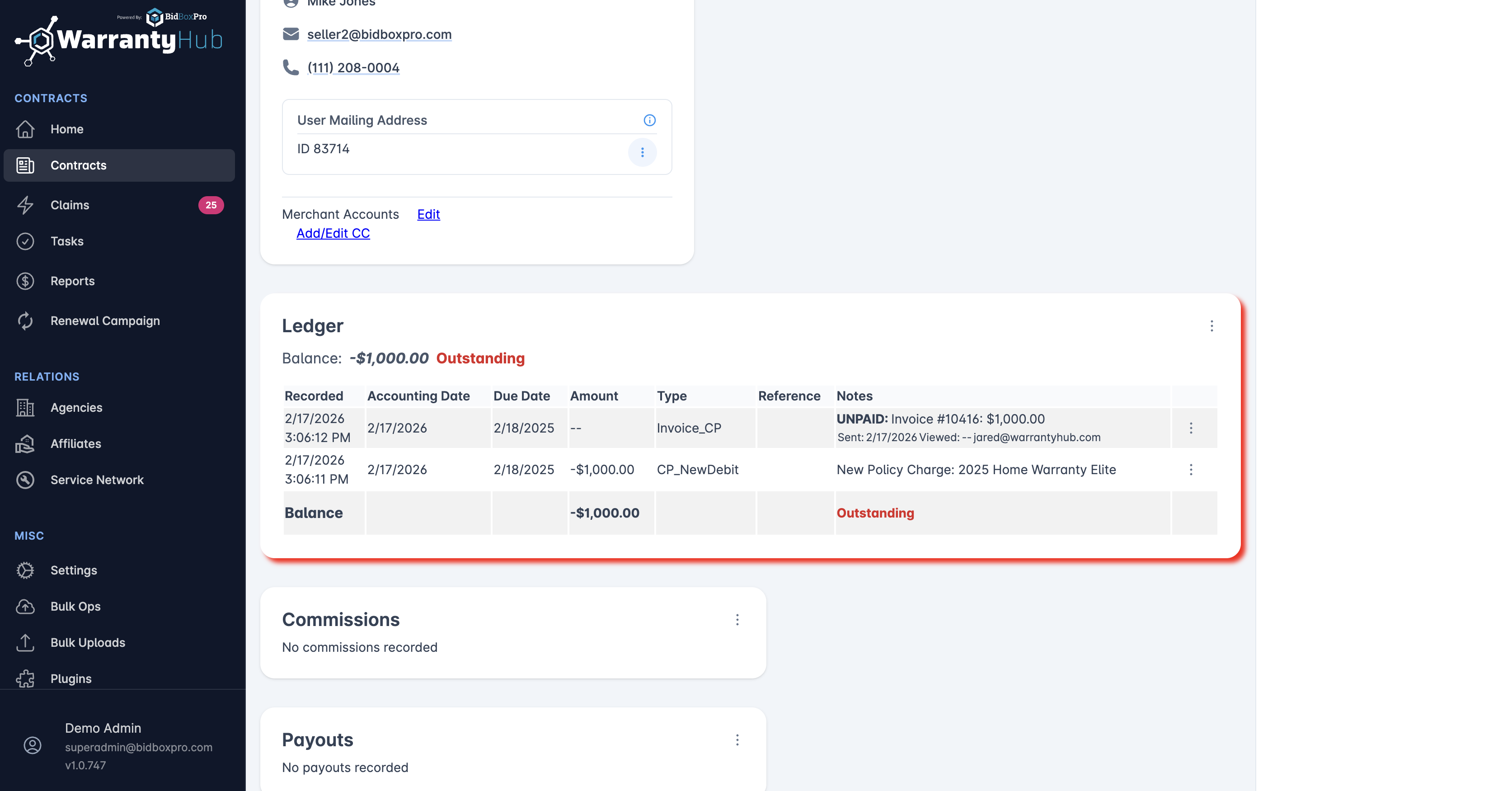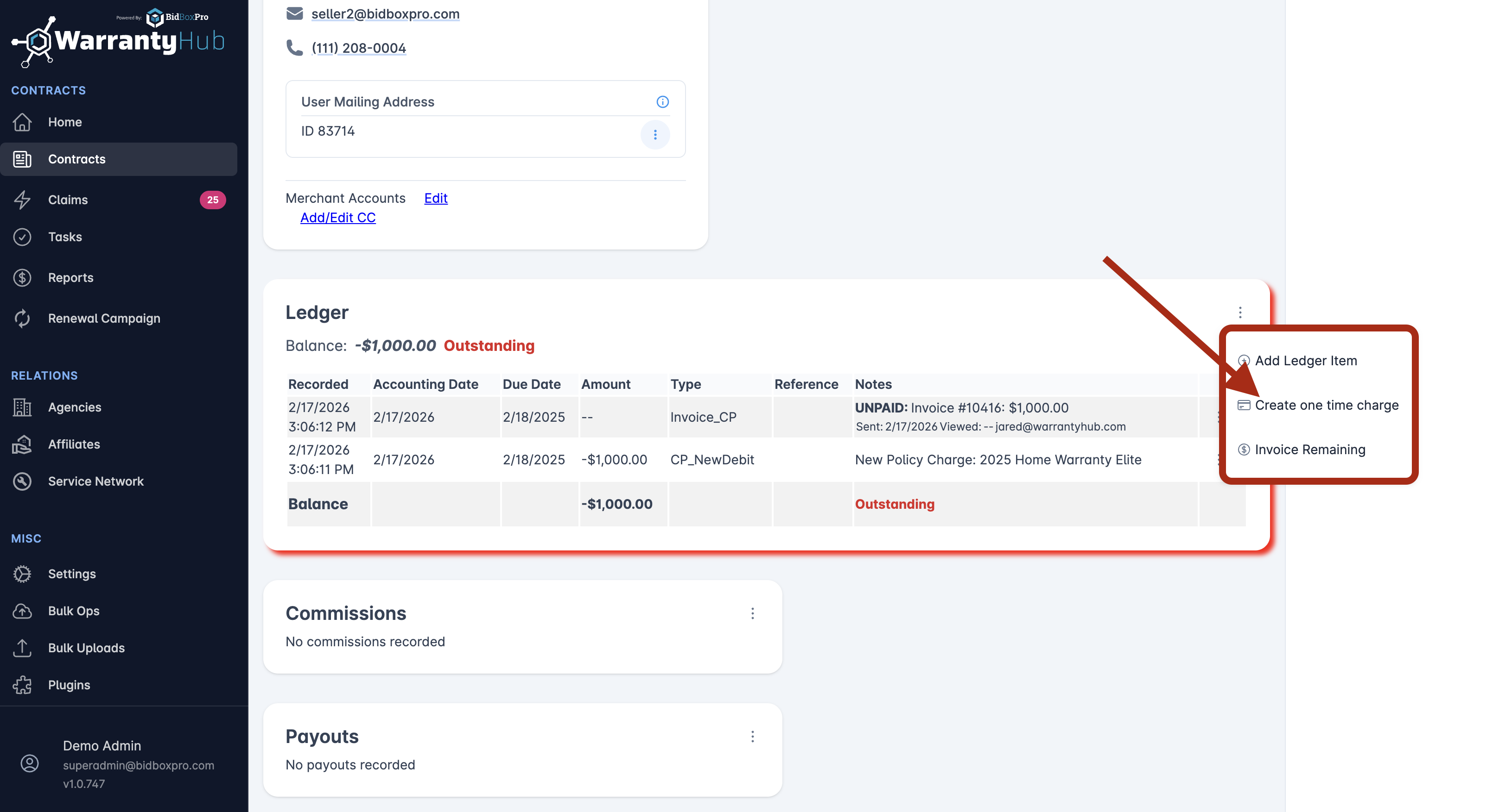 - The ledger will display the initial transaction as an outstanding balance, indicating that a payment is due for the warranty policy.