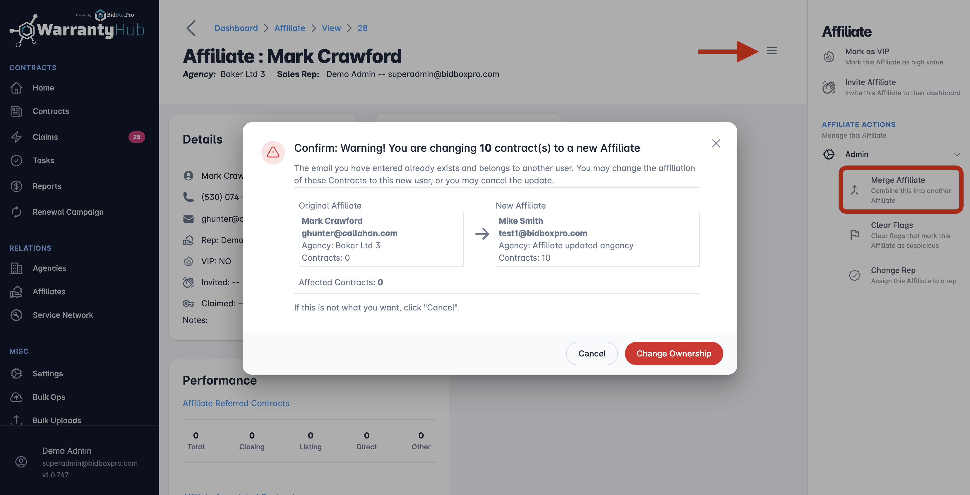 Duplicate affiliate profiles can occur for various reasons -- typos, a change in agency, or integrations with different profile emails. Fortunately, WarrantyHub provides an easy process for merging those user profiles to keep your contracts accurate and organized.